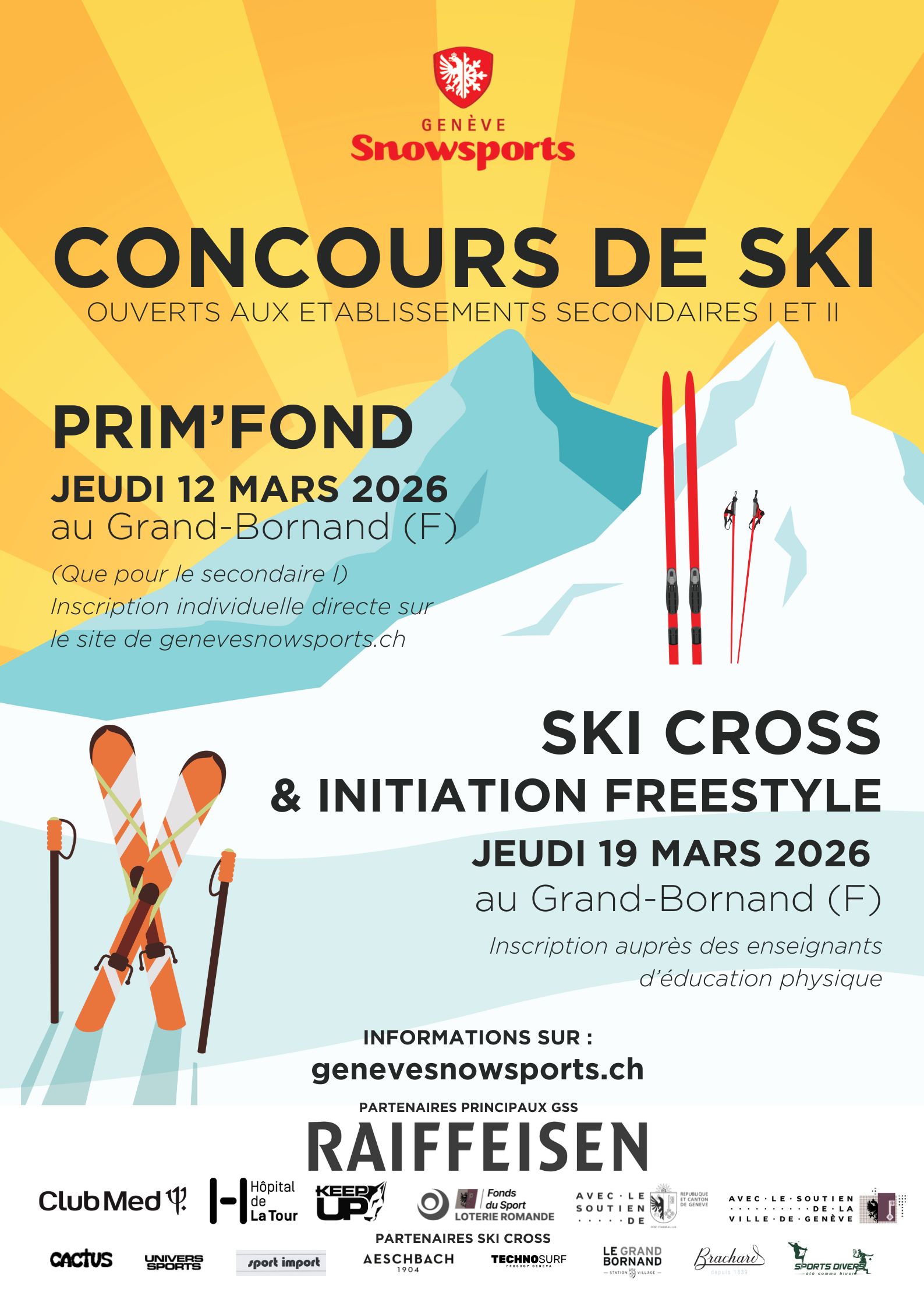 Dans le but de faire découvrir le monde du ski de compétition aux élèves du canton, Genève Snowsports organise chaque année quatre concours populaires ainsi que des initiations au ski alpin, ski de fond et ski freestyle, en partenariat avec le Département de l’instruction publique, de la formation et de la jeunesse (DIP) :